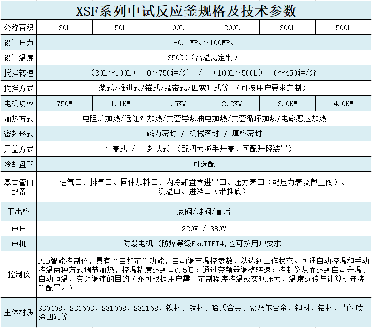 材質(zhì)一般有碳錳鋼、不銹鋼、鋯、鎳基(哈氏、蒙乃爾、因康鎳)合金等有色金屬及其它復(fù)合材料,加熱/降溫方式,可分為電加熱、熱水加熱、導(dǎo)熱油循環(huán)加熱、蒸汽加熱、遠(yuǎn)紅外加熱、外(內(nèi))盤管加熱、電磁感應(yīng)加熱等,夾套降溫和釜內(nèi)盤管降溫等。加熱方式的選擇主要跟化學(xué)反應(yīng)所需的加熱/降溫溫度,以及所需熱量大小有關(guān)。攪拌器有錨式、框式、槳式、渦輪式,刮板式,組合式等多層復(fù)合槳。根據(jù)不同工作環(huán)境的工藝需要進(jìn)行設(shè)計、制造。